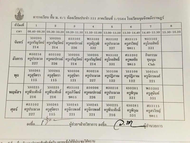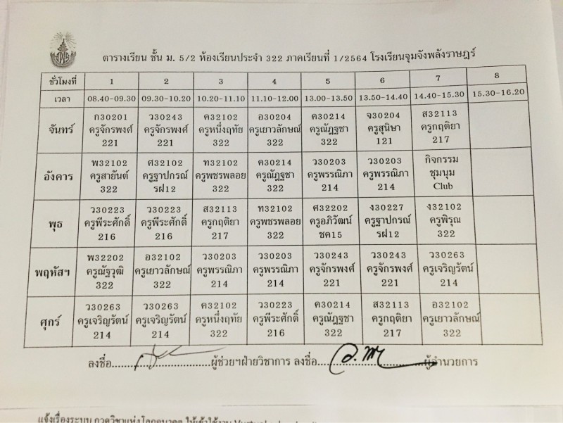 ตารางเรียน ภาคเรียนที่ 2 ปีการศึกษา 2564
