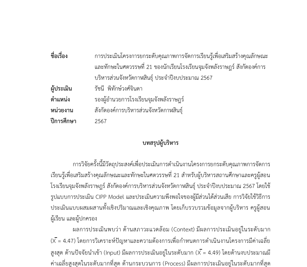 การประเมินโครงการยกระดับคุณภาพการจัดการเรียนรู้เพื่อเสริมสร้างคุณลักษณะ และทักษะในศตวรรษที่ 21 ของนักเรียนโรงเรียนจุมจังพลังราษฎร์ สังกัดองค์การ บริหารส่วนจังหวัดกาฬสินธุ์ ประจำปีงบประมาณ 2567