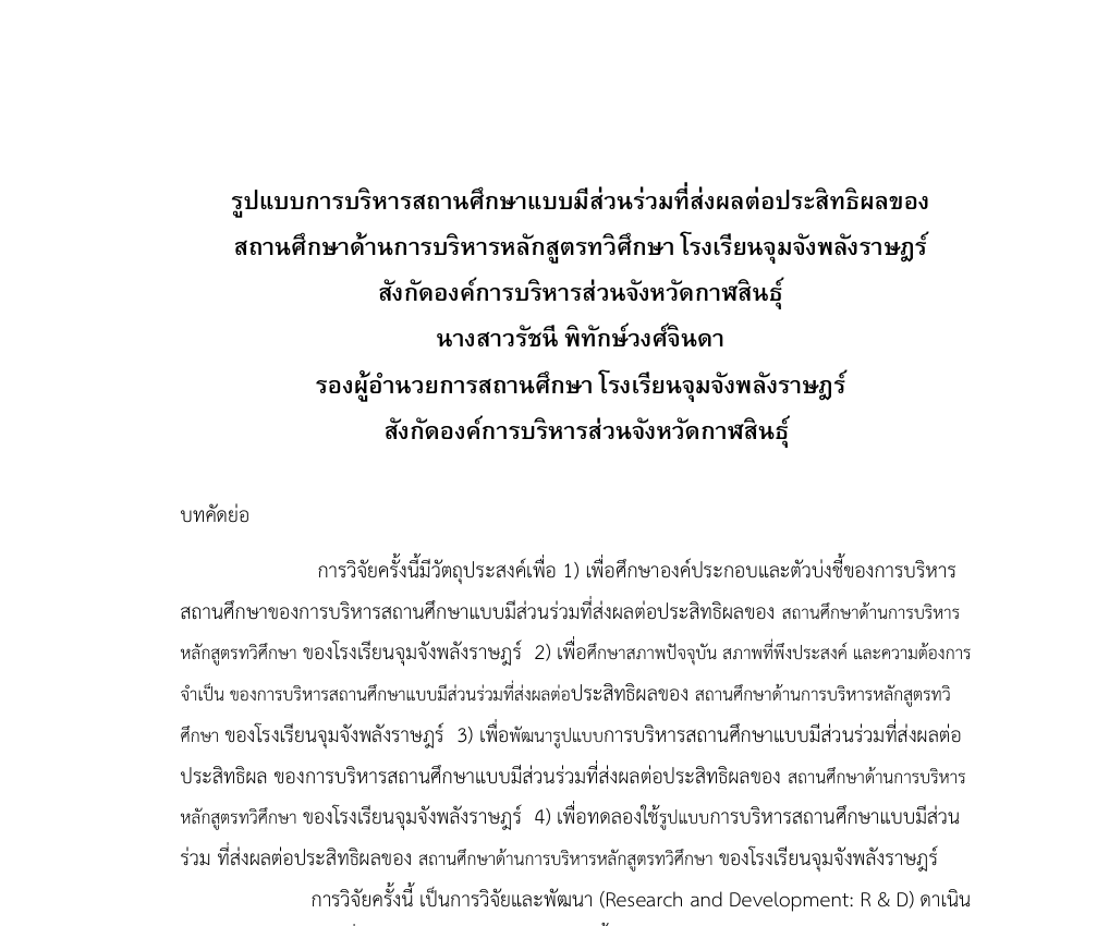 รปแบบการบริหารสถานศึกษาแบบมีส่วนร่วมที่ส่งผลต่อประสิทธิผลของ สถานศึกษาด้านการบริหารหลักสูตรทวิศึกษา โรงเรียนจุมจังพลังราษฎร์ สังกัดองค์การบริหารส่วนจังหวัดกาฬสินธุ์