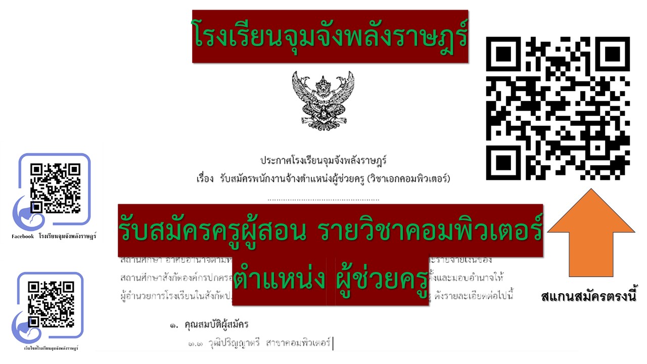 ด้วยโรงเรียนจุมจังพลังราษฎร์ สังกัดองค์การบริหารส่วนจังหวัดกาฬสินธุ์ มีความประสงค์ที่จะรับสมัครคัดเลือกพนักงานจ้าง ตำแหน่งผู้ช่วยครู มาปฏิบัติหน้าที่ครูผู้สอน ปีการศึกษา ๒๕๖๖ จากเงินรายได้สถานศึกษา อาศัยอำนาจตามหนังสือด้วยระเบียบกระทรวงมหาดไทย ว่าด้วยรายได้และรายจ่ายเงินของสถานศึกษาสังกัดองค์กรปกครองส่วนท้องถิ่น ตามหนังสือที่ ๑๖๖๐/๒๕๖๒ เรื่อง แต่งตั้งและมอบอำนาจให้ผู้อำนวยการโรงเรียนในสังกัดปฏิบัติราชการแทน จึงประกาศรับสมัครตำแหน่ง ผู้ช่วยครู ดังรายละเอียดต่อไปนี้