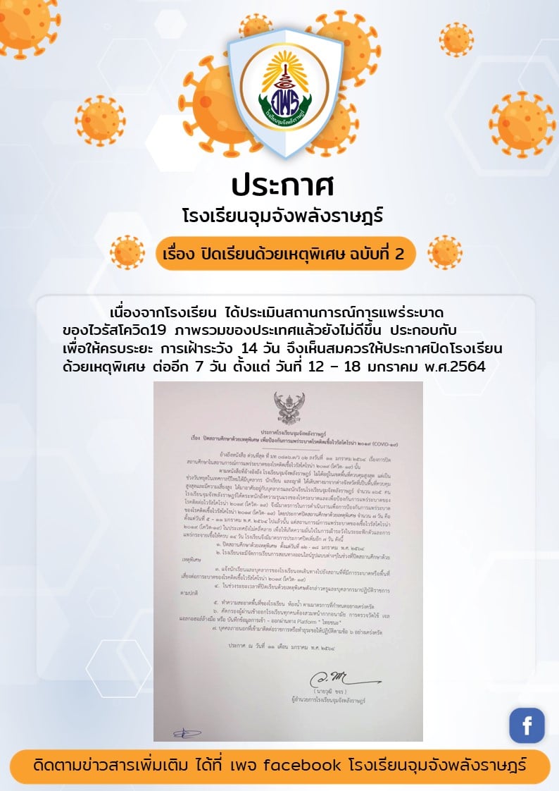 ประกาศ ปิดเรียนด้วยเหตุพิเศษ ฉบับที่ 2 เนื่องจากโรงเรียน ได้ประเมินสถานการณ์การแพร่ระบาดของไวรัสโควิด19 ภาพรวมของประเทศแล้วยังไม่ดีขึ้น ประกอบกับเพื่อให้ครบระยะ การเฝ้าระวัง 14 วัน จึงเห็นสมควรให้ประกาศปิดโรงเรียนด้วยเหตุพิเศษ ต่ออีก 7 วัน ตั้งแต่ วันที่ 12 – 18 มกราคม พ.ศ.2564 |