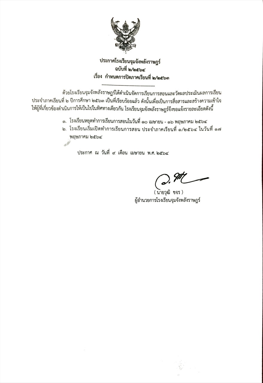 ประกาศหยุดทำการเรียนการสอน ภาคเรียนที่ 2 ปีการศึกษา 2563