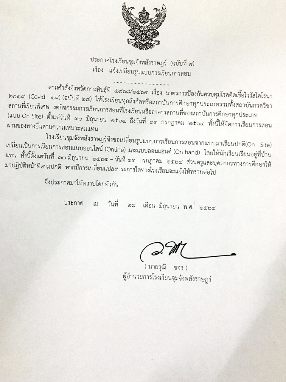 ประกาศโรงเรียนจุมจังพลังราษฎร์ (ฉบับที่ 7) ปีการศึกษา 2564 เรื่อง แจ้งเปลี่ยนรูปแบบการเรียนการสอน