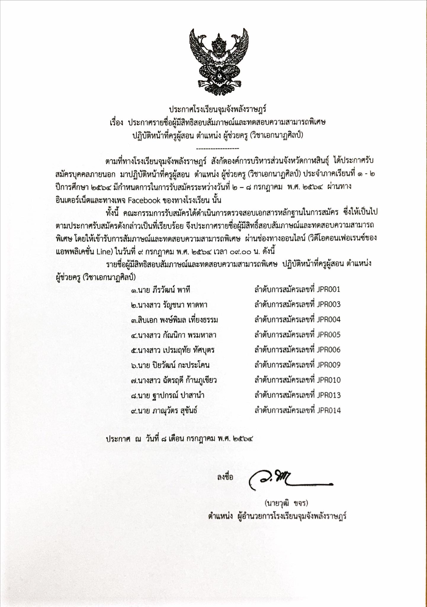 ทั้งนี้ คณะกรรมการรับสมัครได้ดำเนินการตรวจสอบเอกสารหลักฐานในการสมัคร ซึ่งให้เป็นไปตามประกาศรับสมัครดังกล่าวเป็นที่เรียบร้อย จึงประกาศรายชื่อผู้มีสิทธิ์สอบสัมภาษณ์และทดสอบความสามารถพิเศษ โดยให้เข้ารับการสัมภาษณ์และทดสอบความสามารถพิเศษ ผ่านช่องทางออนไลน์ (วิดีโอคอนเฟอเรนซ์ของแอพพลิเคชั่น Line) ในวันที่ 9 กรกฎาคม พ.ศ. 2564 เวลา 09.00 น. ดังนี้