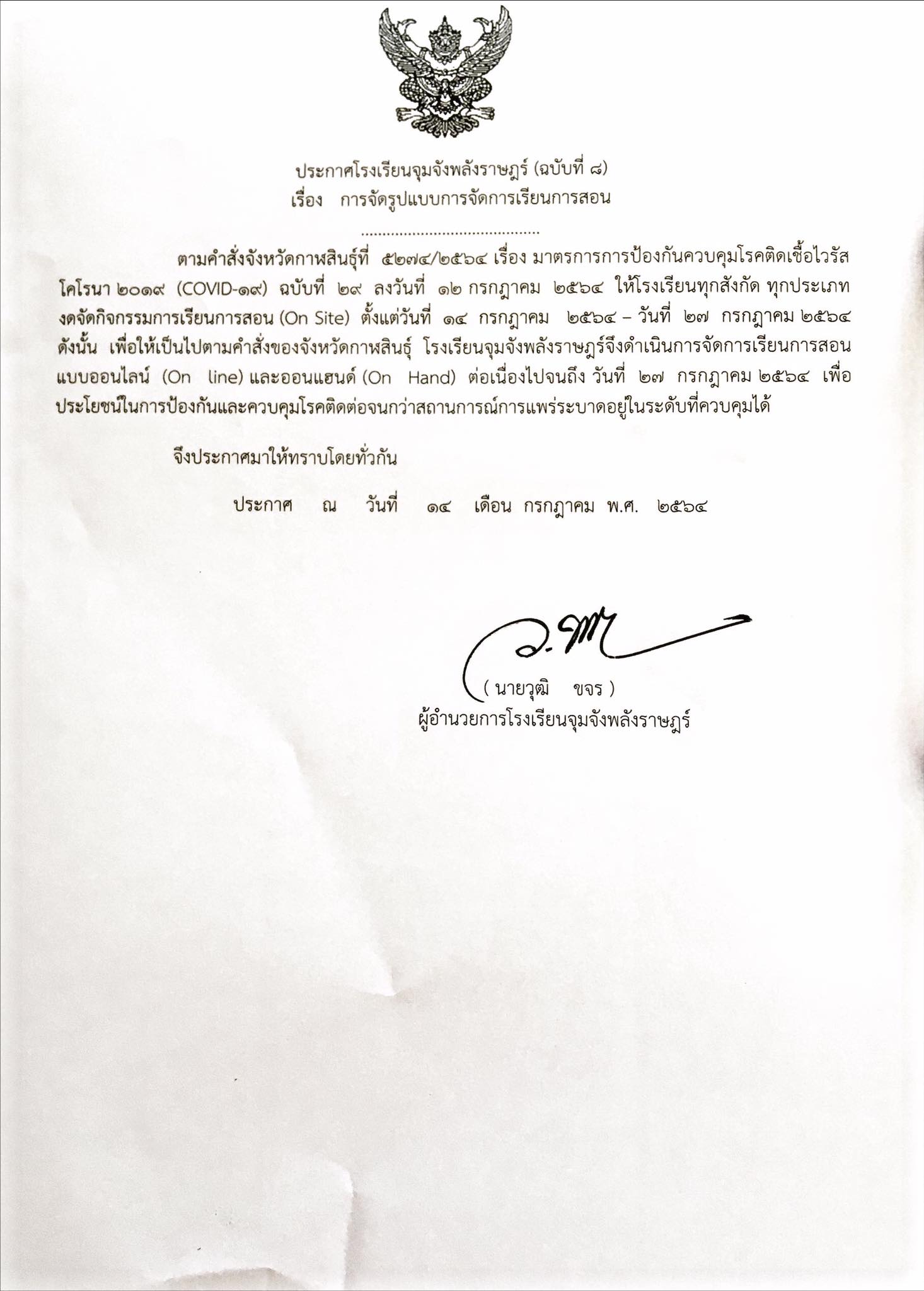 ประกาศโรงเรียนจุมจังพลังราษฎร์ (ฉบับที่ 8) จัดการเรียนการสอนออนไลน์ต่อเนื่องถึงวันที่ 27 ก.ค. 2564
