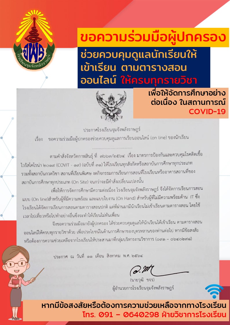 ขอความร่วมมือผู้ปกครองนักเรียนช่วยควบคุมดูแลนักเรียนให้เข้าเรียน ตามตารางสอนออนไลน์ ให้ครบทุกรายวิชา เพื่อให้จัดการศึกษาอย่างต่อเนื่อง ในสถานการณ์COVID-19 หากมีข้อสงสัยหรือต้องการความช่วยเหลือจากทางโรงเรียน