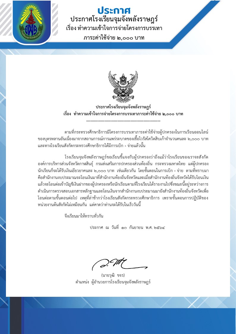 ตามที่กระทรวงศึกษาธิการมีโครงการบรรเทาภาระค่าใช้จ่ายผู้ปกครองในการเรียนออนไลน์ของบุตรหลานอันเนื่องมาจากสถานการณ์การแพร่ระบาดของเชื้อไวรัสโควิดสิบเก้าจำนวนคนละ 2,000 บาท และทางโรงเรียนสังกัดกระทรวงศึกษาธิการได้มีการเบิก - จ่ายแล้วนั้น