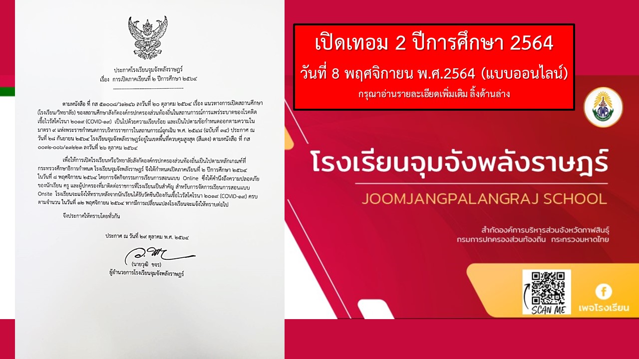 ประกาศโรงเรียนจุมจังพลังราษฎร์ เรื่อง การเปิดภาคเรียนที่ 2 ปีการศึกษา2564