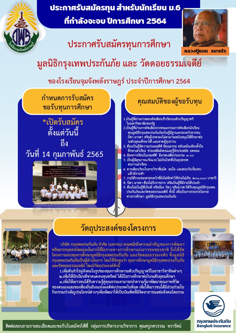 ด้วยมูลนิธิกรุงเทพประกันภัย ได้เล็งเห็นความสำคัญของการศึกษา ซึ่งมีส่วนสำคัญในการพัฒนาทรัพยากรบุคคลของประเทศ ให้มีความรู้ความสามารถและมีคุณภาพในการพัฒนาสังคมและประเทศชาติ จึงมีความประสงค์จะมอบทุนการศึกษา ประจำปีการศึกษา 2564 ให้แก่นักเรียนชั้นมัธยมศึกษาปีที่ 6 ของโรงเรียนจุมจังพลังราษฎร์ ที่ได้ศึกษาต่อมหาวิทยาลัยของรัฐในระดับปริญญาตรี ยกเว้นสถาบันอุดมศึกษาเอกชน