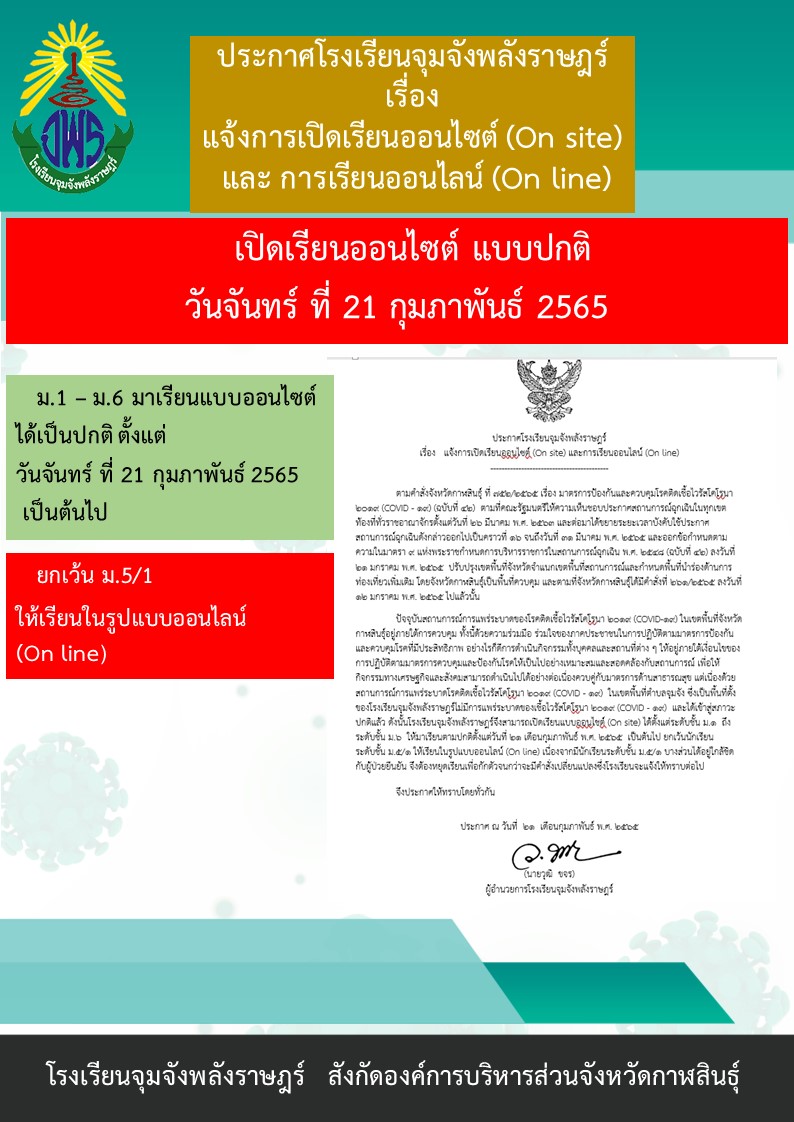 ประกาศโรงเรียนจุมจังพลังราษฎร์ เรื่อง แจ้งการเปิดเรียนออนไซต์ (On site) และการเรียนออนไลน์ (On line) วันที่ 21 กุมภาพันธ์ 2565
