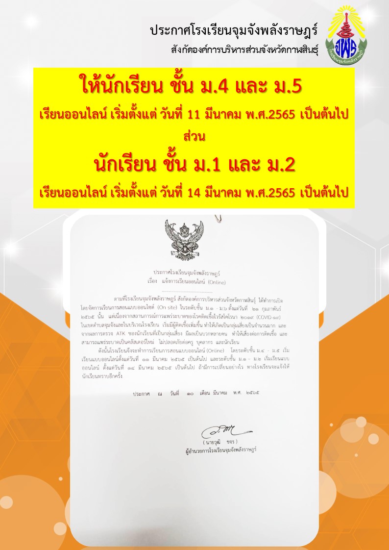 ดังนั้นโรงเรียนจึงจะทำการเรียนการสอนแบบออนไลน์ (Online) โดยระดับชั้น ม.๔ - ม.๕ เริ่มเรียนแบบออนไลน์ตั้งแต่วันที่ ๑๑ มีนาคม ๒๕๖๕ เป็นต้นไป และระดับชั้น ม.๑ - ม.๒ เริ่มเรียนแบบออนไลน์ ตั้งแต่วันที่ ๑๔ มีนาคม ๒๕๖๕ เป็นต้นไป ถ้ามีการเปลี่ยนอย่างไร ทางโรงเรียนจะแจ้งให้