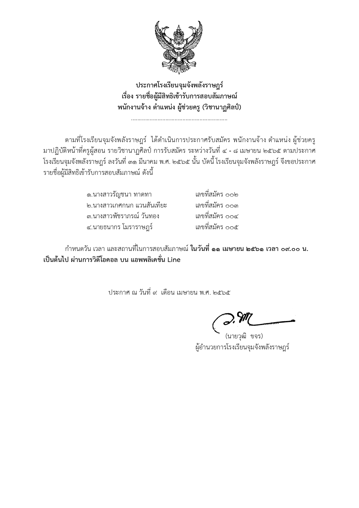 ตามที่โรงเรียนจุมจังพลังราษฎร์ ได้ดำเนินการประกาศรับสมัคร พนักงานจ้าง ตำแหน่ง ผู้ช่วยครู มาปฏิบัติหน้าที่ครูผู้สอน รายวิชานาฏศิลป์ การรับสมัคร ระหว่างวันที่ 4 - ๘ เมษายน ๒๕๖5 ตามประกาศโรงเรียนจุมจังพลังราษฎร์ ลงวันที่ 31 มีนาคม พ.ศ. ๒๕๖5 นั้น บัดนี้ โรงเรียนจุมจังพลังราษฎร์ จึงขอประกาศรายชื่อผู้มีสิทธิเข้ารับการสอบสัมภาษณ์ ดังนี้