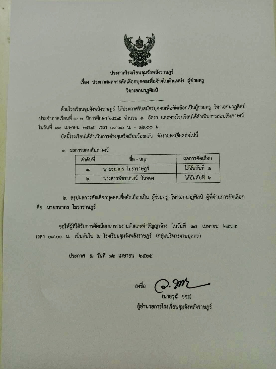 ประกาศผลคัดเลือกบุคคลเพื่อจ้างในตำแหน่ง ผู้ช่วยครู วิชาเอกนาฏศิลป์