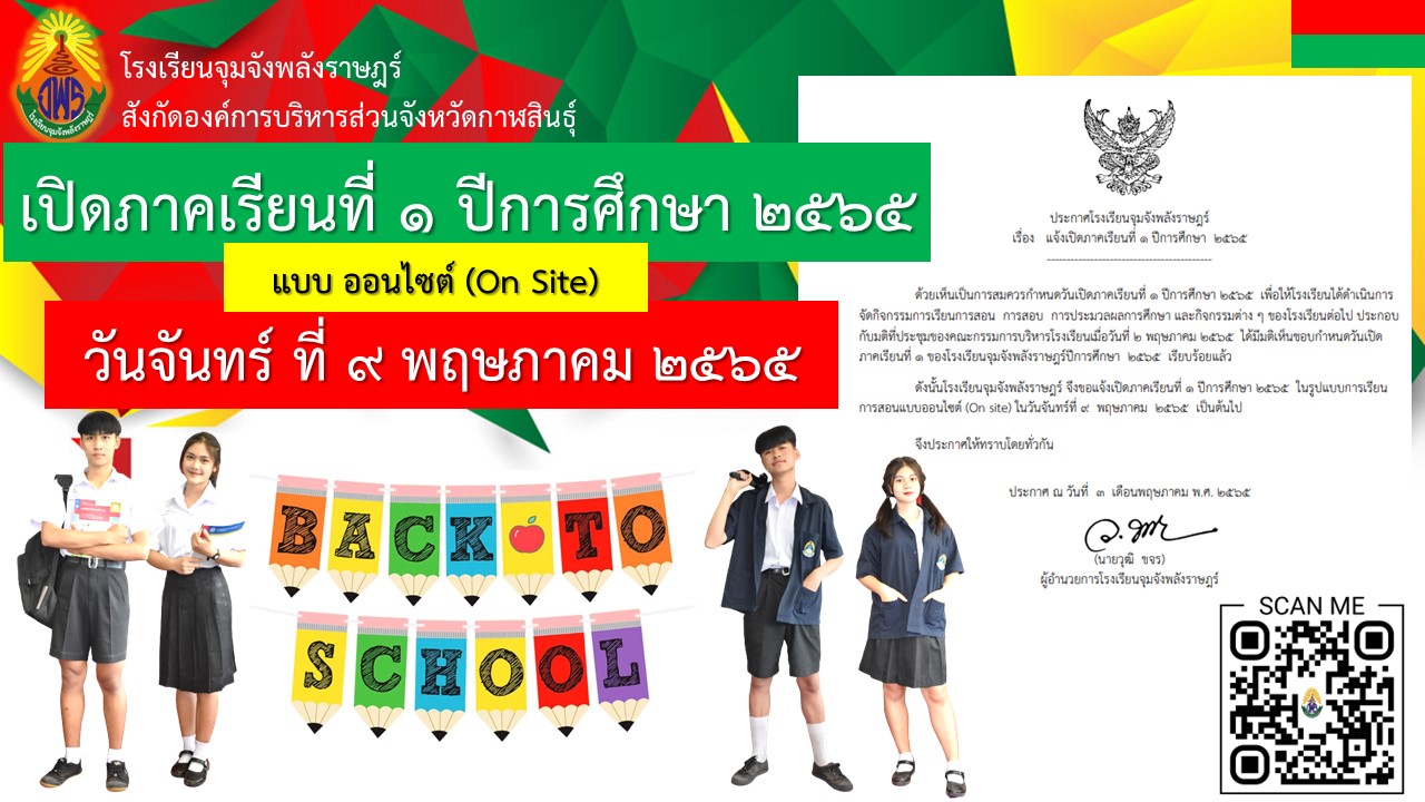 ดังนั้นโรงเรียนจุมจังพลังราษฎร์ จึงขอแจ้งเปิดภาคเรียนที่ ๑ ปีการศึกษา ๒๕'๖๕ ในรูปแบบการเรียนการสอนแบบออนไซต์ (On site ในวันจันทร์ที่ ๙ พฤษภาคม ๒๕๖๕ เป็นต้นไป